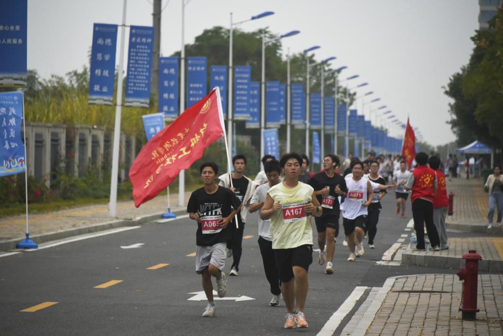 赛道沿校园围墙绵延铺展,串联起校内外独有的秋日景致与青春律动。学校专业教师、校医全程护航,确保活动安全有序。各二级学院学生党支部发挥战斗堡垒作用,组织师生在10个保障点提供志愿服务。90余名教师下沉社区,与学生们并肩奔跑,传递温暖与鼓励。