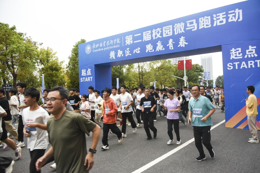 10月29日下午,赣州职业技术学院校园化身为青春与活力的海洋。随着一声清脆的发令声响,第二届校园微马跑正式拉开帷幕,参加者以奔跑的姿态诠释“赣职匠心,跑赢青春”活动主题,用汗水与坚持书写了一幅生动的育人画卷。党委书记温学延宣布活动启动并发令,党委副书记汤晓军,党委委员、纪委书记廖凌,党委委员、副校长林梅等在家领导和2000余名师生参加活动。