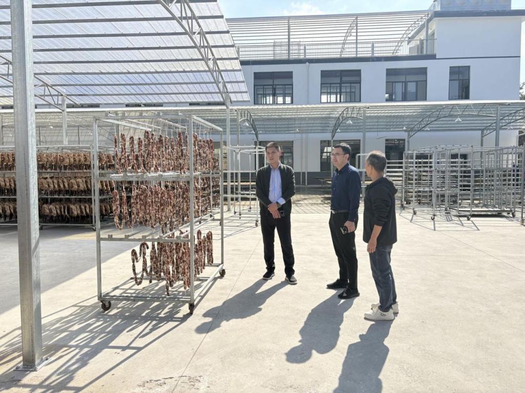 温学延一行还前往乡村振兴特色产业点邓旺德板鸭厂实地调研。在基地负责人的带领下,实地查看板鸭腌制、晾晒、包装等生产环节,详细了解基地规模、生产工艺、产品销路及经济效益。