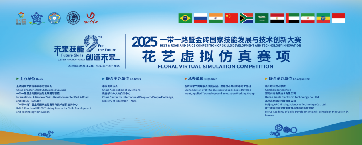 11月21日至23日,2025“一带一路”暨金砖国家技能发展与技术创新大赛花艺虚拟仿真赛项(全国赛)在赣州职业技术学院成功举办。来自全国各地的技能精英齐聚数字赛场,展开传统花艺美学与现代虚拟技术相融合的巅峰对决,集中展现了高等院校在花艺设计和虚拟仿真领域的技能与创新风采,生动诠释了科技赋能艺术美学、数字传承文化精髓的办赛理念,为“一带一路”文化互鉴与艺术发展注入智慧动能。