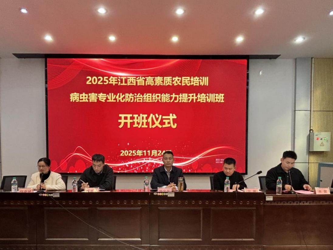 11月24日下午,2025年江西省高素质农民培训——病虫害专业化防治组织能力提升培训班在赣州开放大学一楼报告厅隆重开班。江西省植保植检站副站长陈忠平,赣州职业技术学院党委委员、副校长方敏,赣州开放大学干部教育培训处处长伊志斌等领导出席开班仪式。开班仪式由赣州职业技术学院现代农林工程学院党总支书记巫健主持。