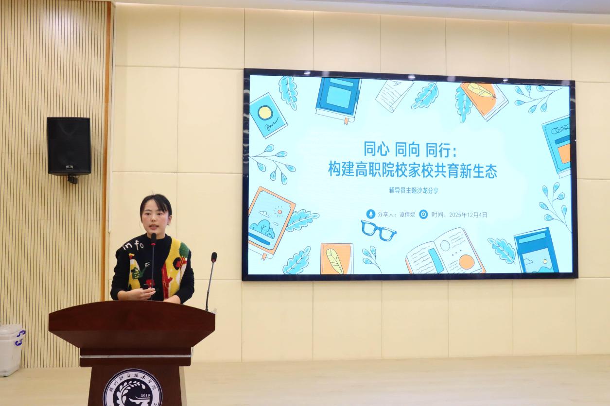 随后,本次沙龙特邀的江西应用技术职业学院社会管理学院团总支书记谭倩妮围绕活动主题作了专题分享。她以“同心、同向、同行”为主线,系统阐述了提升家校协同育人实效的路径。谭倩妮指出,家校同心的关键在于真诚倾听与共情,建立深度信任关系。她结合工作实际案例,深入剖析了当前家校共育中的常见挑战,强调辅导员要精准发力,不断创新工作方法与沟通路径,切实推动家校携手同行、共育成长。
