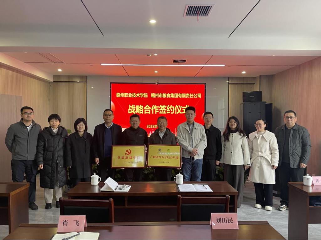 12月25日上午,学校与赣州市粮食集团有限责任公司(简称“赣粮集团”)战略合作签约仪式在赣粮集团办公大楼举行。双方签署战略合作协议,共同为“产教融合人才培养基地”“党建联建单位”揭牌,标志着赣南地区粮食产业与职业教育以党建为纽带、以产业为支撑的深度协同发展正式启动。