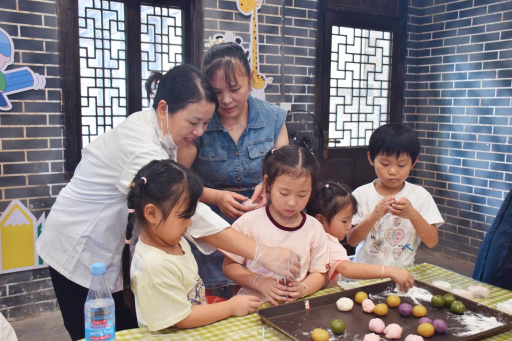 活动现场,党员教师涂家涛发挥专业特长,以通俗语言为孩子们讲解冰皮月饼的食材特性、营养知识及中秋饮食文化渊源,随后示范称量面粉、揉制冰皮、调配馅料等关键步骤,强调“比例控制”“温度把控”等专业要点。学生志愿者则以“小老师”身份分组行动,协助孩子们分发食材、纠正揉制手法,耐心解答“冰皮为什么会粘手”“馅料怎么包才不会漏”等问题——从精准称量50克冰皮,到将馅料均匀裹入、用模具压出中秋主题花纹,学生志愿者在实践中巩固专业技能,更在与孩子的互动中深化“专业服务民生”的认知。