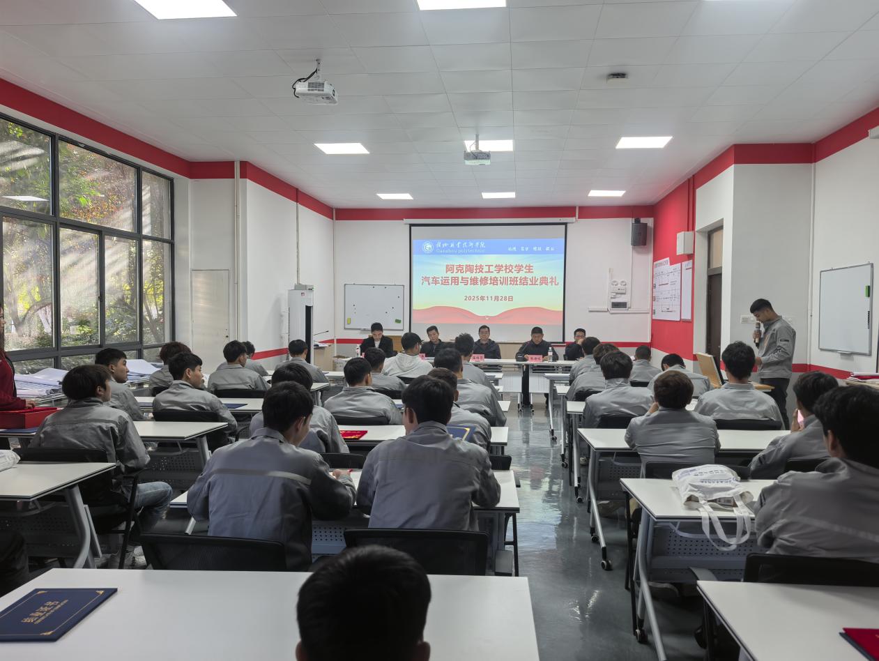 作为赣新两地深化职业教育对口支援的重要实践,本次培训班于9月22日正式开班。赣州职业技术学院精准对接阿克陶县产业发展需求,为学员量身定制了涵盖新能源汽车、智能网联、汽车改装、二手车鉴定等前沿领域的课程体系,采用“理论讲授+实训操作”的沉浸式教学模式,依托设施完善的实训基地开展系统性培养。两个多月里,学员们快速适应新环境,以饱满热情深耕专业,在实操车间锤炼本领,最终交出了亮眼答卷——全部顺利通过课程考核,其中34人成功考取汽车维修工初级工证书。