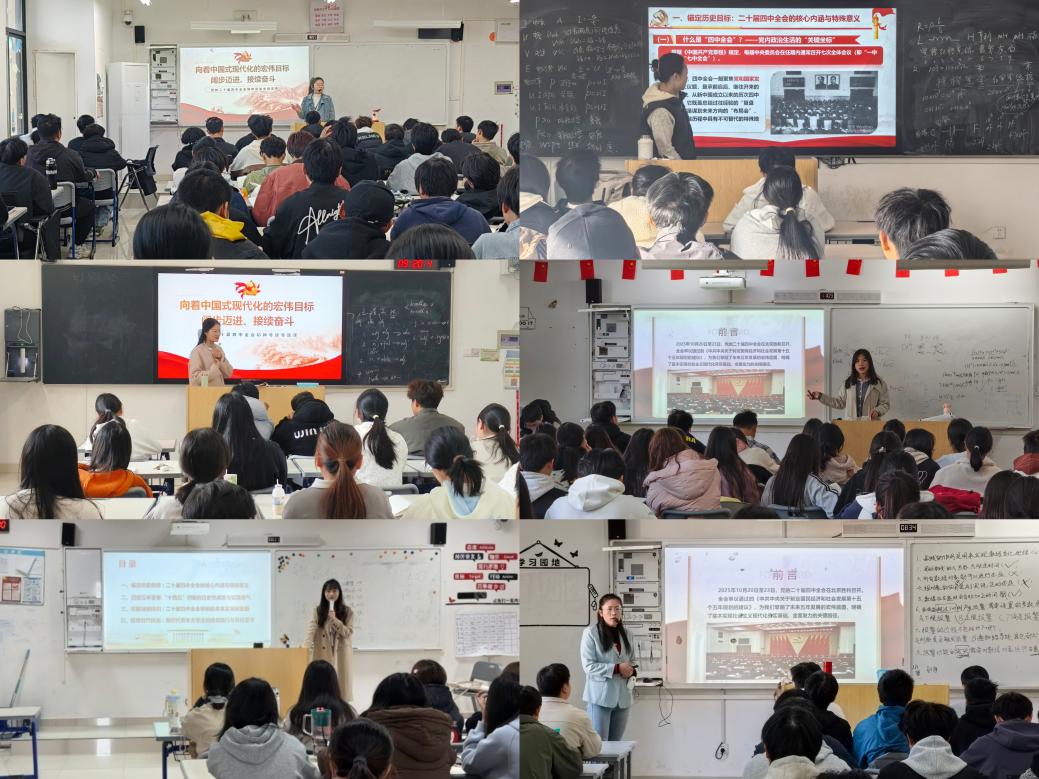 为引导青年学子深刻把握党的二十届四中全会精神实质,将个人成长融入中国式现代化建设宏伟征程,近日,我校马克思主义学院组织思政课教师以“向着中国式现代化宏伟目标阔步迈进、接续奋斗”为主题,深入各班级开展专题宣讲活动,推动全会精神进校园、进课堂、进头脑,引导学生以青春之力赋能民族复兴。