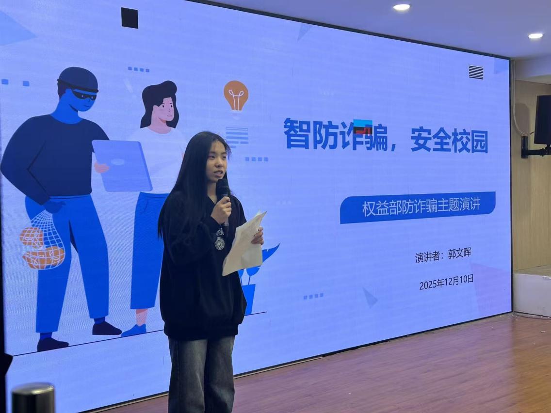 活动伊始,权益部成员郭文晖同学以一场深入浅出的反诈主题演讲拉开序幕。她梳理了新型网络诈骗与传统诈骗的特征与演变,结合身边真实案例,生动还原了“冒充公检法”“杀猪盘”“刷单返利”“网贷”等高发骗局的场景。演讲不仅层层剖析了各类骗局作案手法、目标人群与话术陷阱,更具针对性地阐述了“三不一多”核心防范原则——不轻信陌生信息、不透露核心隐私、不轻易转账汇款、多通过官方渠道核实,并清晰指明了110、“96110”反诈专线等关键求助渠道。整场讲解逻辑严密、内容扎实,兼具专业深度与现实指导意义。