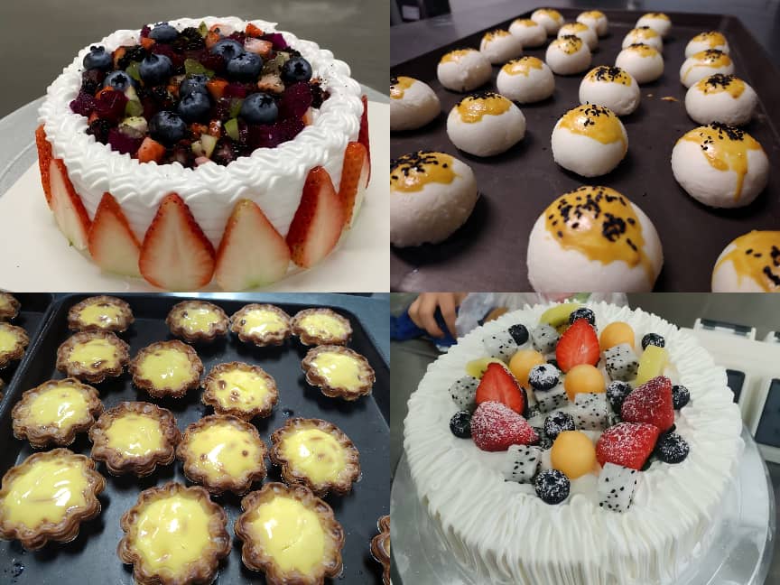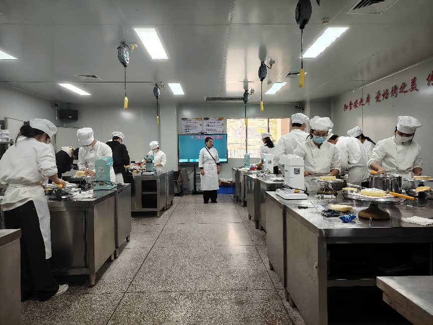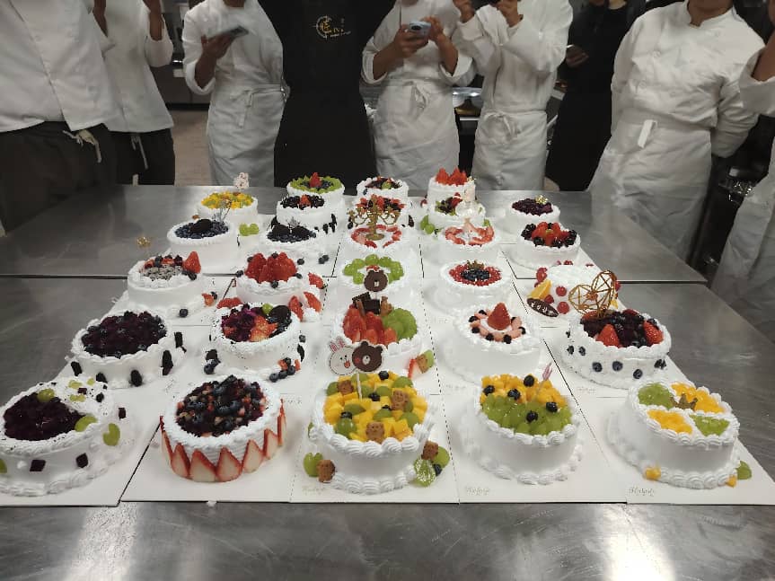 本次实训突破了传统教学模式,以“真实项目驱动”为核心,构建了“课堂即车间、教学即生产”的教学场景,充分彰显了学院“产教融合、校企共育”的育人特色。实训内容紧密对接行业实际与市场需求,注重学习过程与生产流程的无缝衔接。实训初期,徐师傅着重强调:“基础技术是工艺之本,更是质量之基。”在后续的实训中,他系统拆解糕点制作各环节的基础动作与技术要点,针对关键操作进行“手把手纠正”“一对一指导”,帮助学生夯实基本功。随着实训推进,课程内容从技法拓展延伸至创意表达。学生不仅系统掌握了海绵蛋糕、重油蛋糕等多元产品的核心工艺与科学原理,更在“海盐芝士爆浆蛋糕”“提拉米苏”等综合创意产品制作中,将设计思维、审美品位与情感表达融入蛋糕裱花、创意装饰等环节,实现了从技术练习到创意输出的跨越,也实现了操作技艺与综合素养的双重提升。
