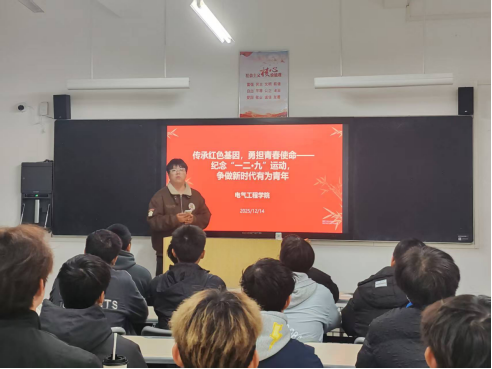 为纪念“一二·九”抗日救亡运动,激励青年学子铭记历史、传承精神,12月14日,电气工程学院团总支在鲁班楼325教室组织开展了“一二·九”历史故事分享主题团日活动。学院团总支成员及各班级团支部团员代表参加活动,活动由团总支书记龚成懿老师主持。