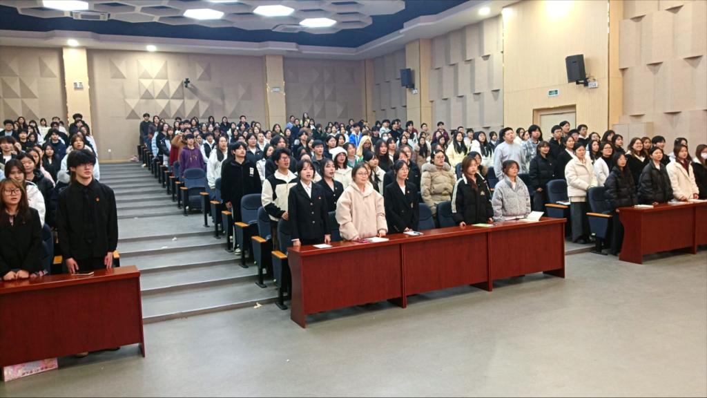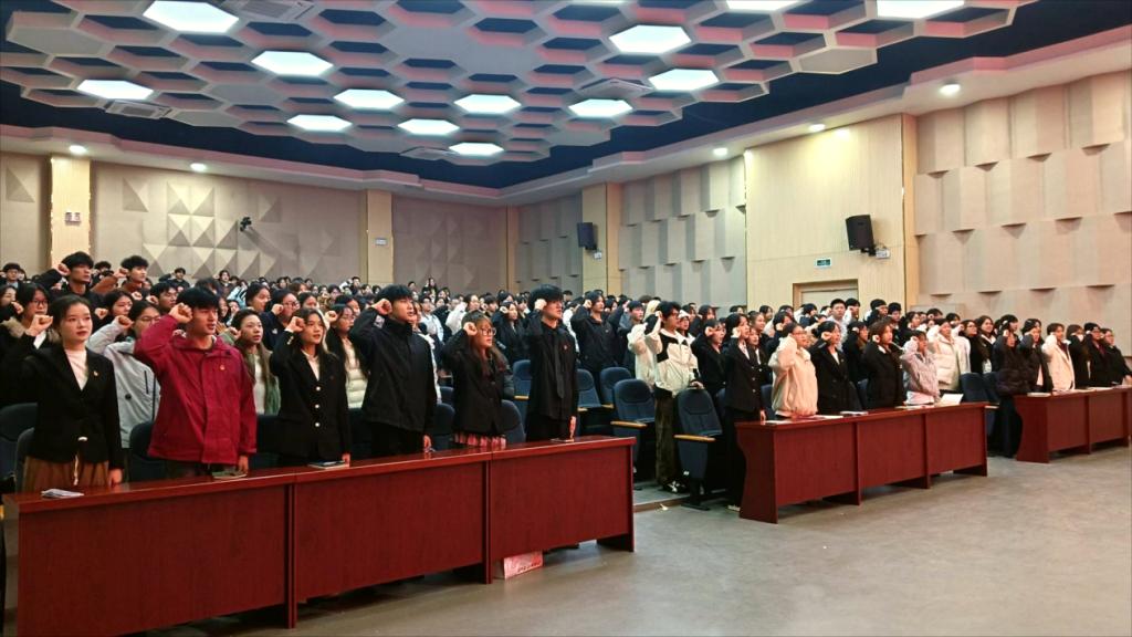 在领誓人俞金贝同学的带领下,全体新团员面向团旗,举起右拳庄严宣誓。铿锵有力的誓言在会场回荡,彰显着青年一代听党话、跟党走的坚定决心和为实现中华民族伟大复兴贡献青春力量的使命担当。仪式在全体人员齐声高唱《中国共产主义青年团团歌》中圆满落幕,激昂的旋律进一步激发了团员青年的荣誉感与归属感。