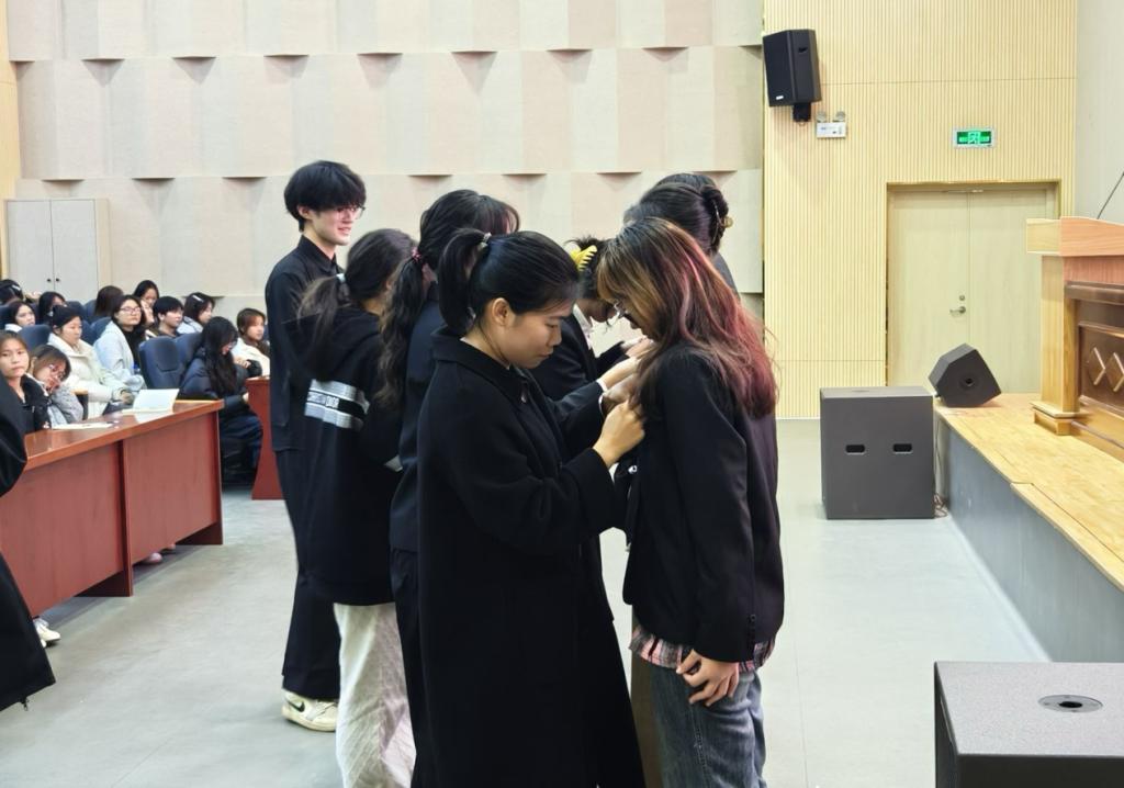 在庄严肃穆的氛围中,团总支书记与老团员代表一同为新团员佩戴团徽。团徽在灯光下熠熠生辉,不仅是中国共产主义青年团的标志,更象征着光荣、责任与奉献。每一枚团徽的佩戴,都承载着组织的殷切期望与先辈的爱国初心,提醒新团员时刻以团员标准严格要求自己,在学习和生活中发挥模范带头作用。