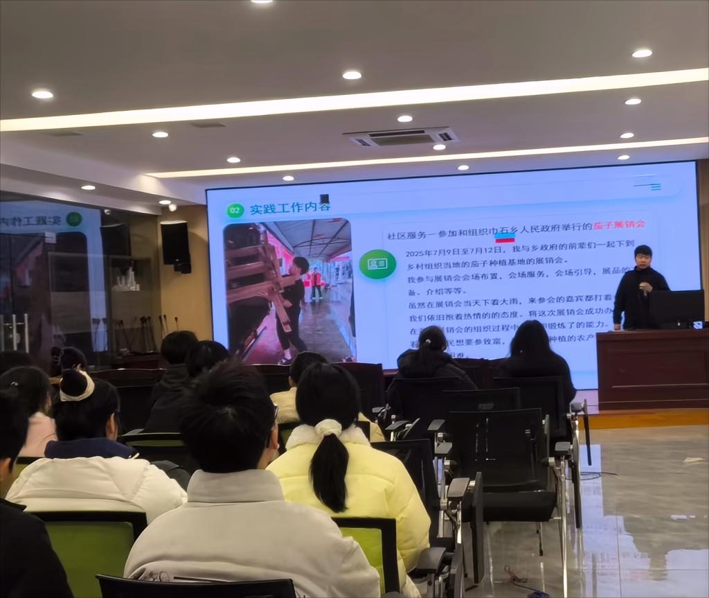 在经验分享环节中,赵仁同学结合自身在巾石乡人民政府参与日常事务处理、协助老年人办理社保卡、帮助困难家庭申请补贴等实践经历进行分享,生动诠释了农林学子扎根乡土、服务乡亲的责任担当。他表示,“返家乡”不仅是课堂知识转化为实践能力的练兵场,更是读懂家乡发展、厚植乡土情怀的成长之旅。赵仁同学真挚的分享让在场同学深受触动,进一步激发了投身实践的热情。