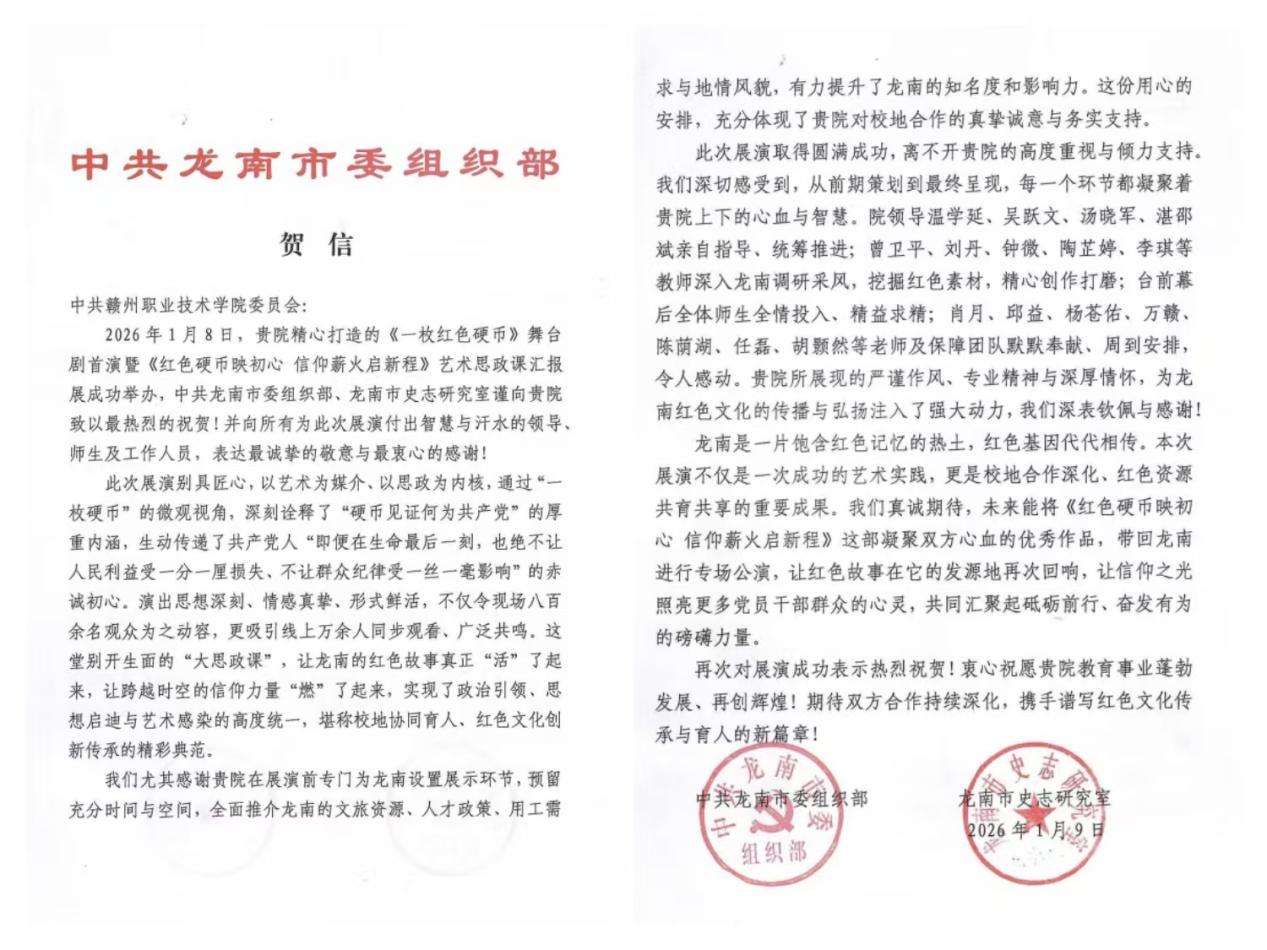 近日,我校收到了一封满载深情与敬意的贺信,来自中共龙南市委组织部及龙南市史志研究室。信中,龙南市对学院成功举办的《一枚红色硬币》舞台剧首演暨《红色硬币映初心信仰薪火启新程》艺术思政课汇报展表达了高度赞扬与衷心感谢,共同见证了红色文化在新时代的创新传承与校地合作的实践成果。