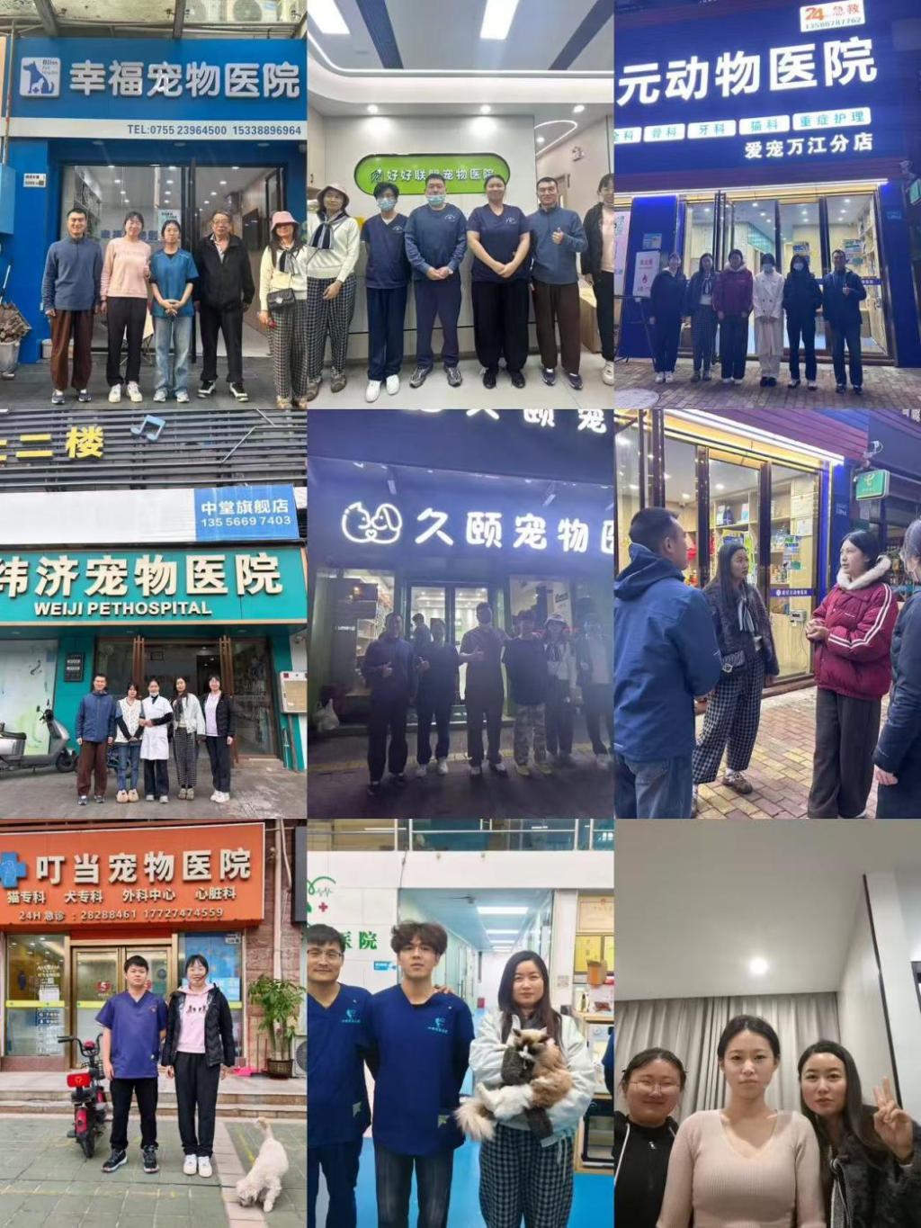 在为期五天的行程中,教师团队先后走访了纬济、心诺、叮当等九家知名动物医院,覆盖了深圳和东莞两地的主要动物医疗机构。每到一处,教师们不仅与企业管理层进行深入交流,还专程看望了正在这些医院实习的10余名学生,详细了解他们的工作环境、实习内容和生活状况。