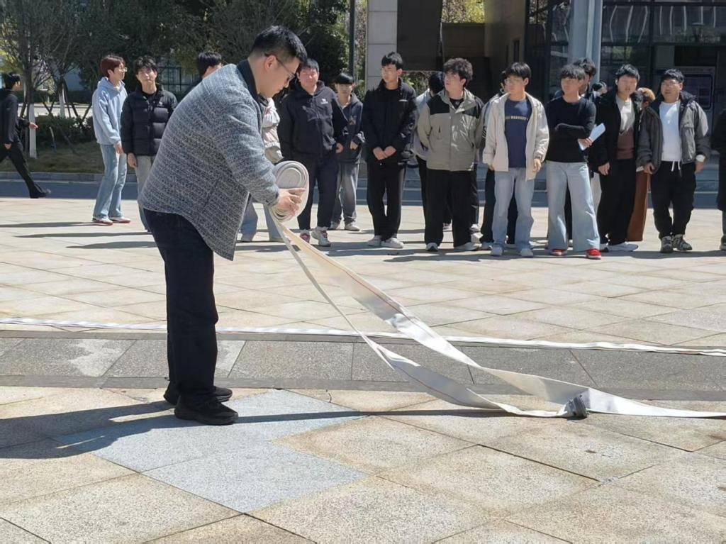 3月11日下午1点40分,吉顺老师现场演示了干粉灭火器的使用方法,并精炼概括了“提、拔、握、压”四字操作技巧;随后,曹晓刚老师演示了消防水带快速展开、连接与使用方法。参训的学生和老师都积极参与了灭火器及水带的实操体验,进一步筑牢了安全防线,为后续演练开展打下坚实基础。