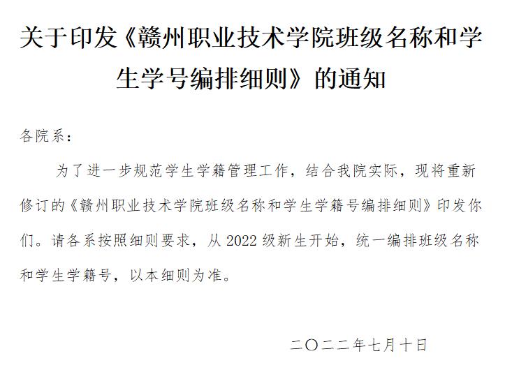 关于印发《赣州职业技术学院班级名称和学生学号编排细则》的通知