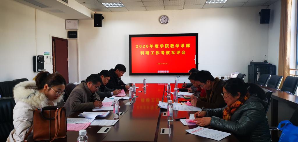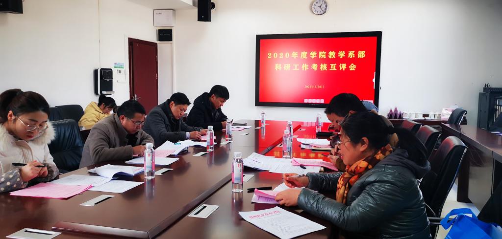各教学系部负责人一一介绍了本系部2020年度在科研工作中取得的成绩,并对照《2020年度学院教学系部科研工作量考核标准》阐述自评得分情况及相关佐证材料。科研处、教务处负责人对课题项目、论文等科研业绩进行确认。各系部自评后再进行互评打分。