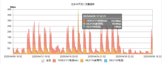 4月6日—5月6日,校园网接入终端的最大并发数为34.67k,最高流入带宽385Mbps,最高流出带宽为103Mbps。
