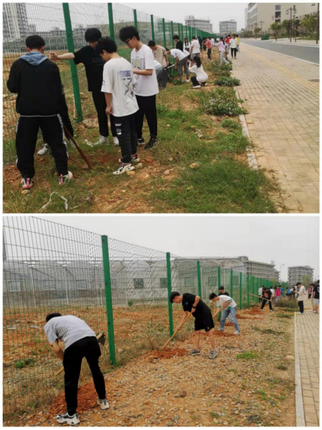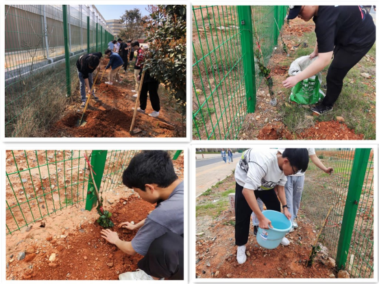 在现代农业基地围栏周边,师生们热情高涨、分工协作,开穴、施基肥、扶正花苗、挥锹培土、提水浇灌,大家互帮互助,配合默契,共同栽下了一棵棵小花苗。他们脸上流下辛劳的汗水,却挂着喜悦的微笑。