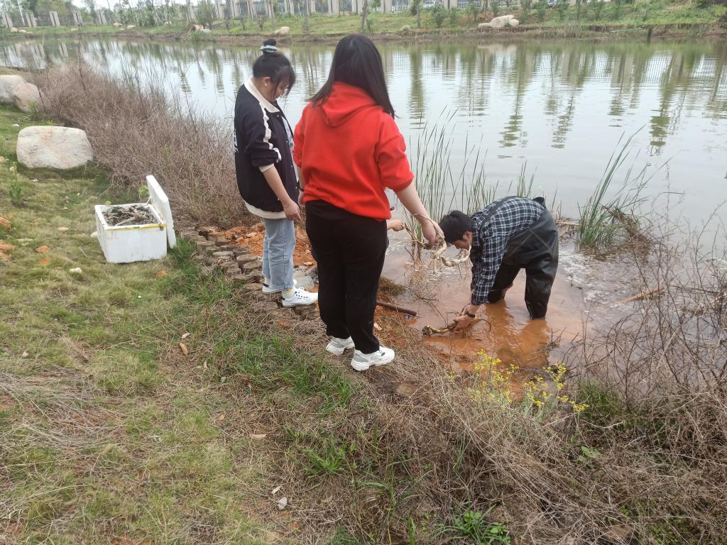 熊增宏老师准备好了莲藕种苗,并进行种植要点讲解。随后同学们穿好防水服,选择靠岸低洼处清理淤泥,并将带2-3芽的种芽插在淤泥20公分左右……通过大家的团结协作,顺利完成种植任务。