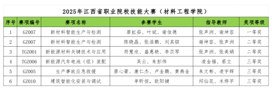近日,2025年江西省职业院校技能大赛圆满落幕。材料工程学院参赛团队凭借扎实的专业功底、默契的团队协作,在多个赛项中奋勇争先,荣获省级一等奖1项、二等奖2项、三等奖3项。