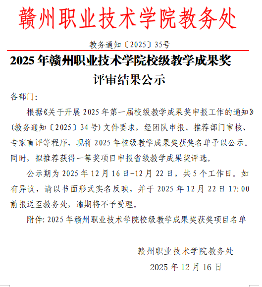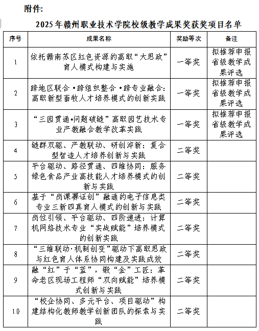 2025年赣州职业技术学院校级教学成果奖评审结果公示