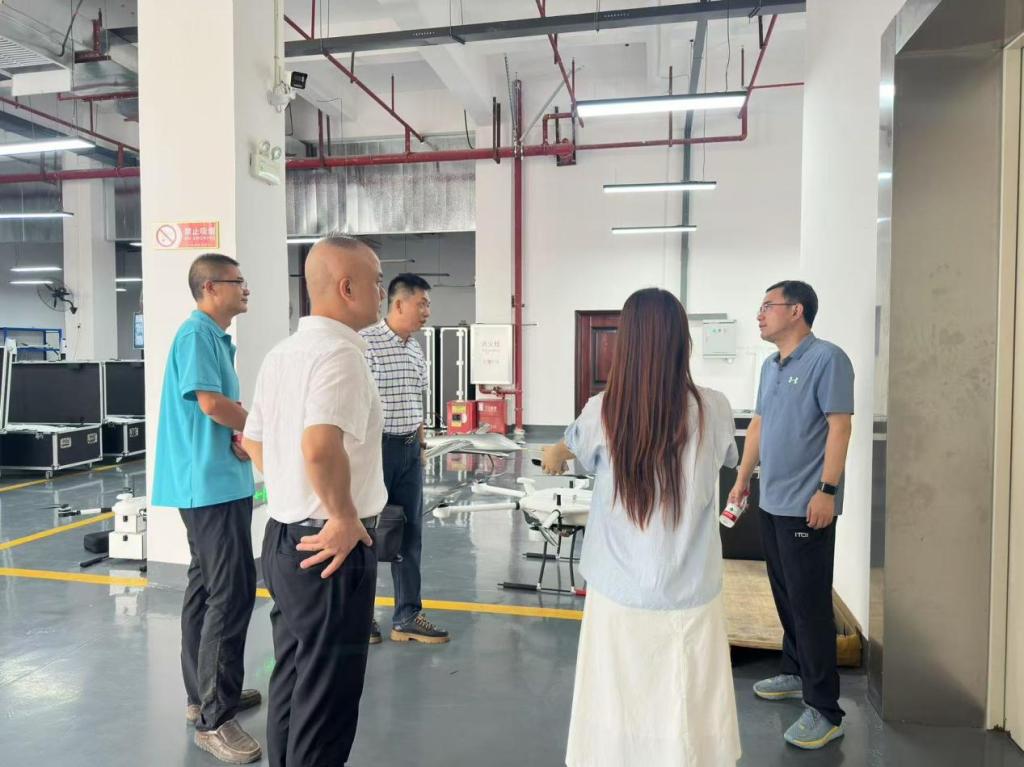 在明德新材(赣州)技术有限公司总经理彭晓勇的陪同下,温学延一行参观了企业的“生产车间、产品展厅与研发中心”。彭晓勇详细介绍了当前主流无人机机型(如农业植保机、测绘无人机、安防巡检无人机、物流无人机、行业定制机等)、核心技术优势、应用场景拓展以及未来技术发展趋势。