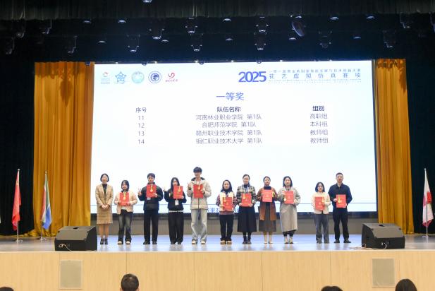 在全场的热切瞩目下,高学鹏庄重宣读获奖名单。本次大赛共产生一等奖14项、二等奖28项、三等奖40项。我校参赛队伍荣获三项一等奖,分别是教师组一等奖获奖选手:廖楠老师、叶罗茜老师;高职组一等奖选手:二队孔林同学、沈嘉华同学;一队刘志芳同学、孙浩铭同学;我校获得赛事“突出贡献奖”。