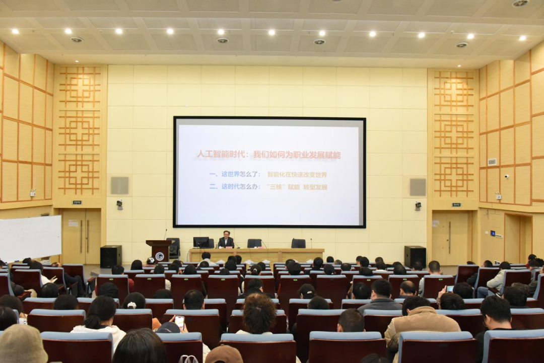 讲座中,童山东围绕“如何为职业发展赋能”这一问题,结合自身多年研究成果,提出智能时代职场发展的10个趋势,即人工智能飞速发展影响各行各业、AI自动化替代越来越多人工工作、新的职业和工作机会将不断涌现、复合型职业技能要求会日趋明显、弹性/灵活的工作方式日益流行、人机协同、人际合作更加紧密、学习目标和学习方式发生跃迁、终身学习将会变得越来越重要、职业成功的素质要求发生变化、职业幸福感的强弱会日显重要。他以“三核”培养为可持续发展赋能为切入点,深度串联专业核心能力、职业核心能力、核心价值观的内在逻辑,结合政策导向与行业发展数据,系统剖析了人工智能技术在智能制造、智慧教育、数字服务等领域的应用案例,深刻阐释了技术革新对传统职业生态的影响与新兴职业的发展机遇。他强调,核心能力是一个人除专业或岗位能力和知识之外的基础能力,是跨岗位、伴随终身的可持续发展能力。既要夯实专业核心能力,让学生掌握贴合产业需求的过硬本领;也要锤炼职业核心能力,让学生具备适配多元岗位的综合能力;更要厚植核心价值观,树立崇德向善、敬业守信的职业信念,让学生涵养立身做人的精神底色。