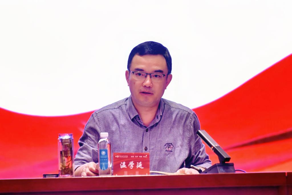 4月22日下午,学校2026年全面从严治党工作暨警示教育大会在行知楼一楼学术报告厅举行,党委书记温学延出席并讲话,在家领导班子成员和全校教职工参会,会议由党委副书记汤晓军主持。