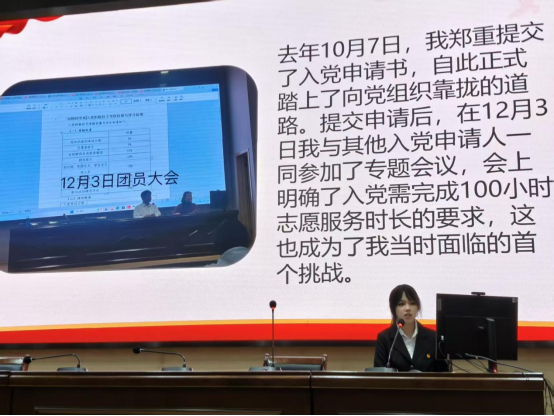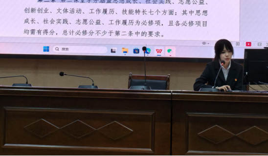 杨庆同学还就“第二课堂学分认定和管理办法”展开了专业且细致的解读。她从学分类型划分、学分获取途径拓展,到认定标准的严格界定,讲解条理清晰、透彻明了,让在场团员对第二课堂学分体系有了全面且深入的认识。第二课堂作为素质教育不可或缺的重要载体,其学分制度的明确具有重大意义。它不仅让团员们直观地看到参与学术科研、志愿服务、文体活动等行为的现实价值,更让大家深刻领悟到:这些丰富多彩的实践,正是锤炼党性修养、展现责任担当的“实战练兵场”。以实际行动向党看齐,不再是一句空洞的口号,而是成了可规划、可践行,助力个人成长与前行的强大动力。