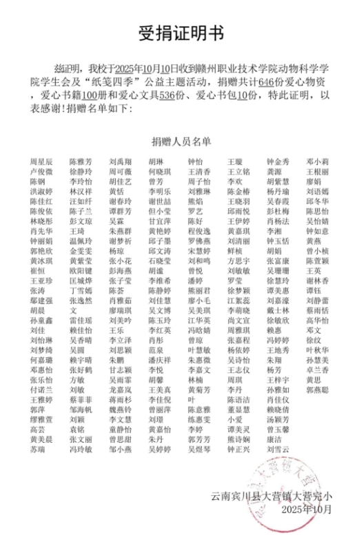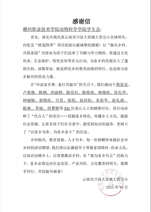 捐赠物资涵盖100册中外名著、科普绘本等书籍,以及536份学习文具、10个爱心书包,既为孩子们带来了知识的滋养,也承载着“以家乡为荣、为家乡奋斗”的殷切期望。大营完小方面还特意准备了感谢信,向动物科学学院的付出表达谢意。大营完小校长表示,这份深情厚谊是照亮乡村教育前路的明灯,学校将以此为激励,引导学生厚植家国情怀,未来用知识反哺乡土。
