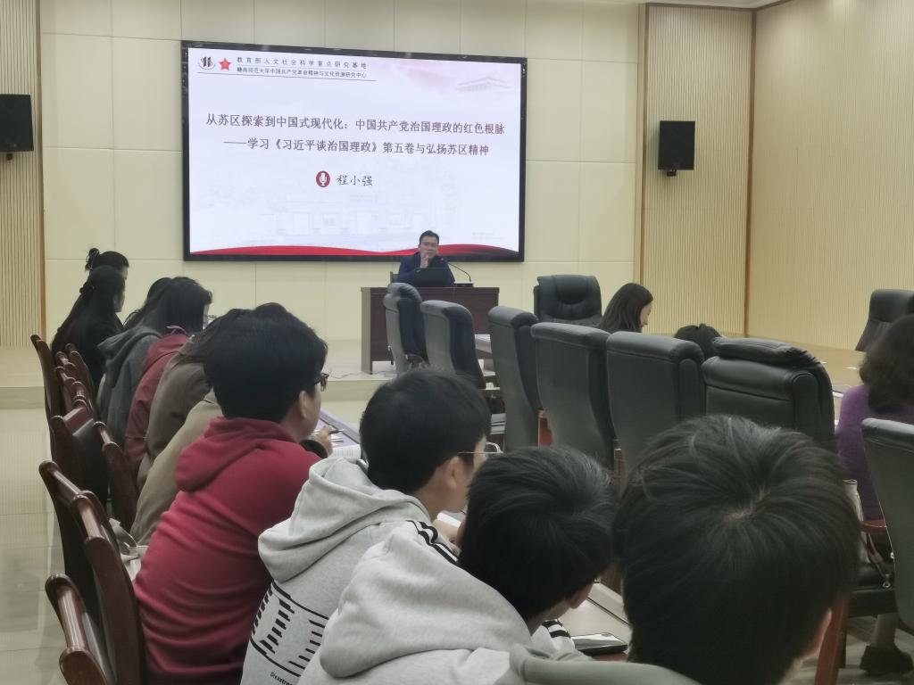 为深入挖掘苏区精神的历史经验和时代内涵,引导广大师生不忘初心、牢记使命,走好新时代的长征路。12月10日,学校“中央苏区红色基因传承研究中心”特邀江西省“四个100”宣讲导师、赣南师范大学马克思主义学院程小强副教授,作题为《从苏区探索到中国式现代化:中国共产党治国理政的红色根脉》专题讲座。学校马克思主义学院全体教师及辅导员代表、学生代表齐聚报告厅,共同聆听本次讲座。