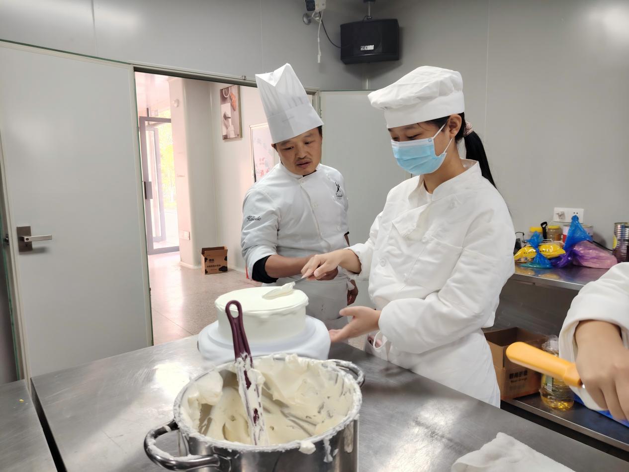本次实训突破了传统教学模式,以“真实项目驱动”为核心,构建了“课堂即车间、教学即生产”的教学场景,充分彰显了学院“产教融合、校企共育”的育人特色。实训内容紧密对接行业实际与市场需求,注重学习过程与生产流程的无缝衔接。实训初期,徐师傅着重强调:“基础技术是工艺之本,更是质量之基。”在后续的实训中,他系统拆解糕点制作各环节的基础动作与技术要点,针对关键操作进行“手把手纠正”“一对一指导”,帮助学生夯实基本功。随着实训推进,课程内容从技法拓展延伸至创意表达。学生不仅系统掌握了海绵蛋糕、重油蛋糕等多元产品的核心工艺与科学原理,更在“海盐芝士爆浆蛋糕”“提拉米苏”等综合创意产品制作中,将设计思维、审美品位与情感表达融入蛋糕裱花、创意装饰等环节,实现了从技术练习到创意输出的跨越,也实现了操作技艺与综合素养的双重提升。