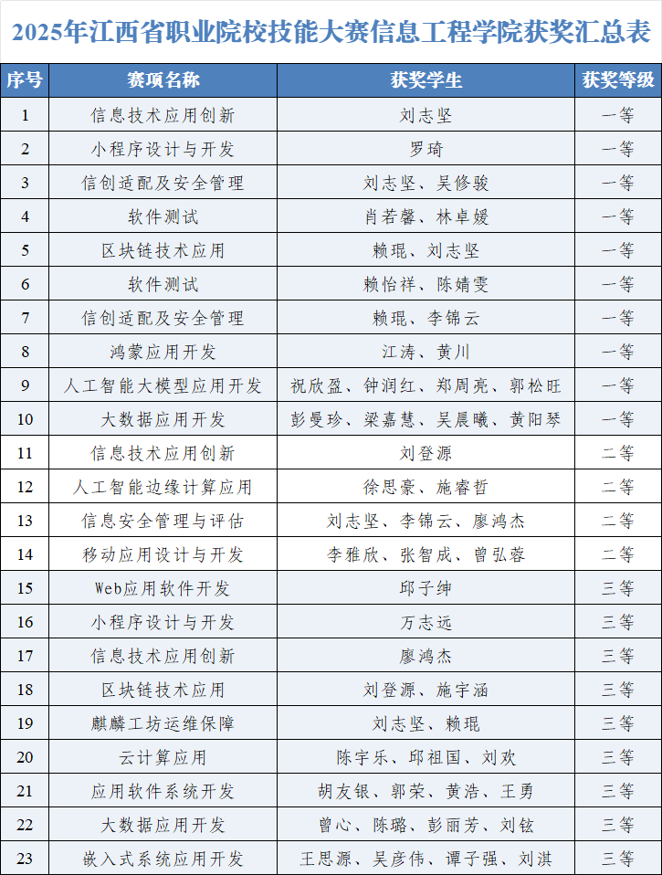 下一步,信息工程学院将以此次大赛为契机,锚定人才培养目标,聚焦双高建设核心任务,优化人才培养模式,完善“岗课赛证”融通体系,强化师资队伍建设,提升专业群与赣粤电子信息产业链的契合度,为革命老区高质量发展示范区建设、为教育强省建设培养更多高技能人才、能工巧匠、大国工匠。
