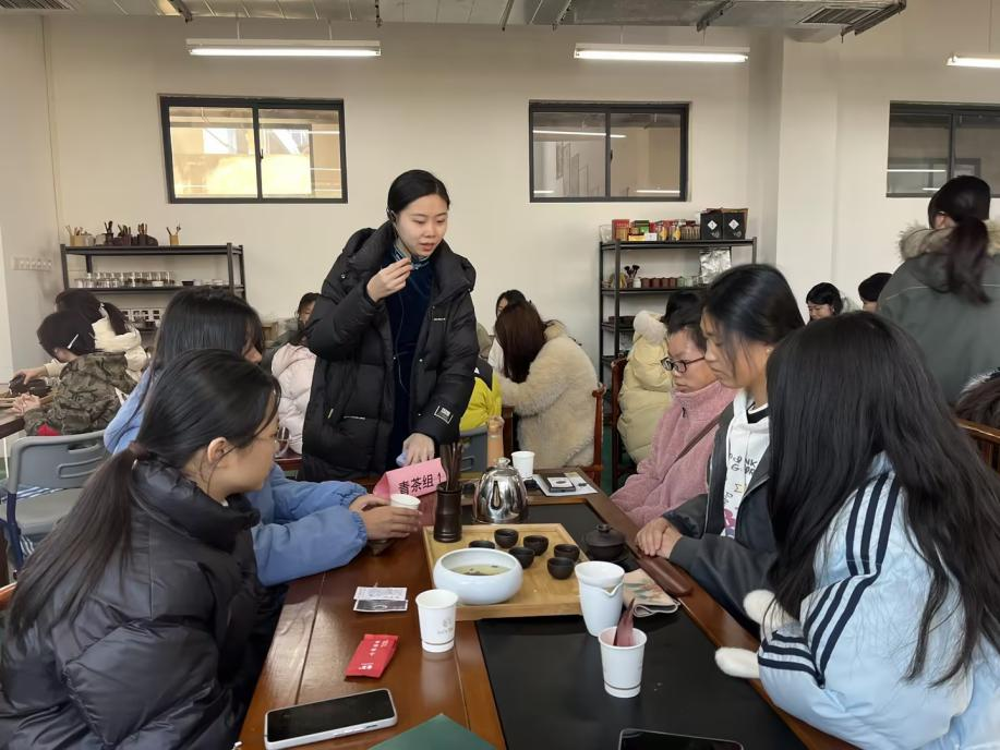茶艺师首先以通俗易懂的方式,讲解了六大茶类的基础特性与辨识要点,同学们围坐聆听,专注记录,不时轻声交流疑问。随后的“茶名速答”小游戏,让现场氛围变得轻松活跃,大家踊跃抢答,在趣味互动中加深了对茶品的记忆。盲盒品鉴与茶艺展示环节尤为受欢迎,参与者在茶艺师和教师的指导下,亲手体验温杯、投茶、注水、出汤等冲泡流程,从观色、闻香、品味三个维度细细感受茶品风味,再结合盲盒内的介绍卡分享品鉴心得,在实践中体悟茶艺的细腻与茶味的层次。整场活动参与度颇高,大家在茶香氤氲中感受传统茶文化的魅力。