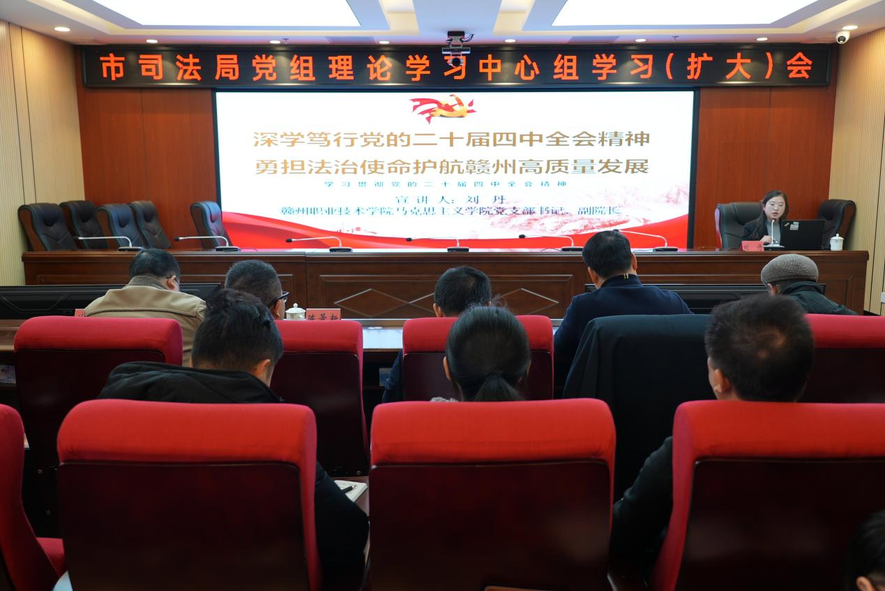 为深入学习贯彻党的二十届四中全会关于社会主义民主法治建设的战略部署,切实推动习近平法治思想在司法行政一线落地见效,充分发挥高校服务地方法治建设作用,1月23日上午,我校马克思主义学院党支部书记、副院长刘丹同志受邀在赣州市司法局党组理论学习中心组学习会上作专题授课,以《深学笃行党的二十届四中全会精神勇担法治使命护航赣州高质量发展》为题,为该局全体干部职工开展法治专题辅导。