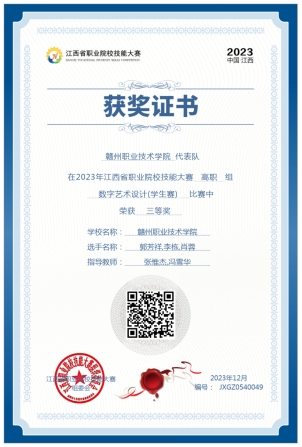 为期两天的2023年江西省职业技能大赛(高职组)数字艺术设计在江西陶瓷工艺美术学院顺利举行。本次比赛共有35所高校选派精英队伍参与,经过激烈的角逐,我系参赛学生团队郭芳祥、李栋、肖榕(指导教师张惟杰、冯雪华)凭借平时的训练积累和坚毅的比赛精神,最终获三等奖。