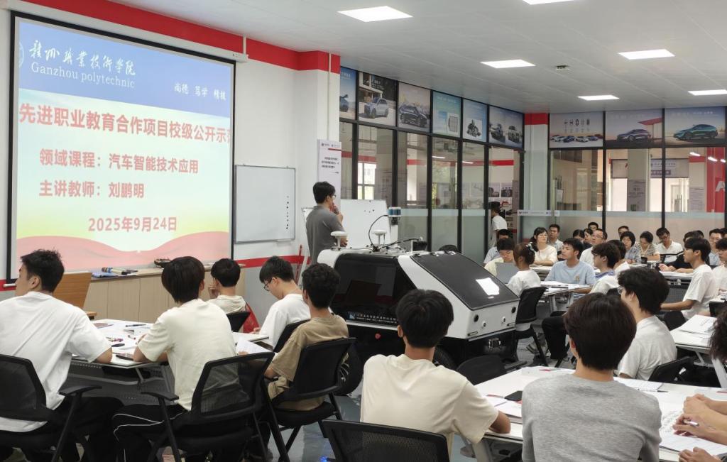 汽车工程学院中德SGAVE项目教学团队教师刘鹏明以领域课程汽车智能技术应用——学习情境2智驾系统为例,根据人才培养方案和课程教学目标,结合学校实际教学环境,按照“导学、信息、规划、决策、执行、检查、评价、系统化”八步教学法完成以用户委托书为载体的知识技能课堂教学。课堂上,中德SGAVE班学生踊跃讲解小组团队精心设计的课程信息海报,分享项目教学法所获得的知识技能提升、语言表达能力和团队合作精神。