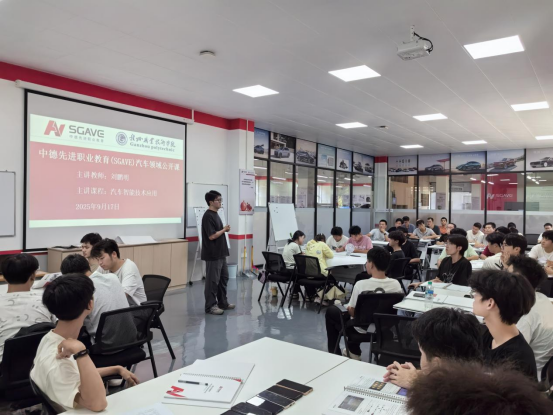 中德SGAVE项目教学团队教师刘鹏明以学习领域汽车智能技术应用为例,按照项目“导学→信息→规划→决策→执行→检查→评判→系统化”八步教学法,通过合理布置学习任务,学生小组主动获取课程信息、制作学习知识海报、现场展示学习成果,充分展现行动导向、“以学生为中心”教学法。课后,学生主动地分享了中德SGAVE项目教学法、教学模式所获得的收获,不仅提高职业素养、专业知识和职业技能,也提升语言表达能力、团队合作精神。随后,学院组织项目教学法交流会、“理论教授+虚拟仿真+实训实操”一体化教学模式。