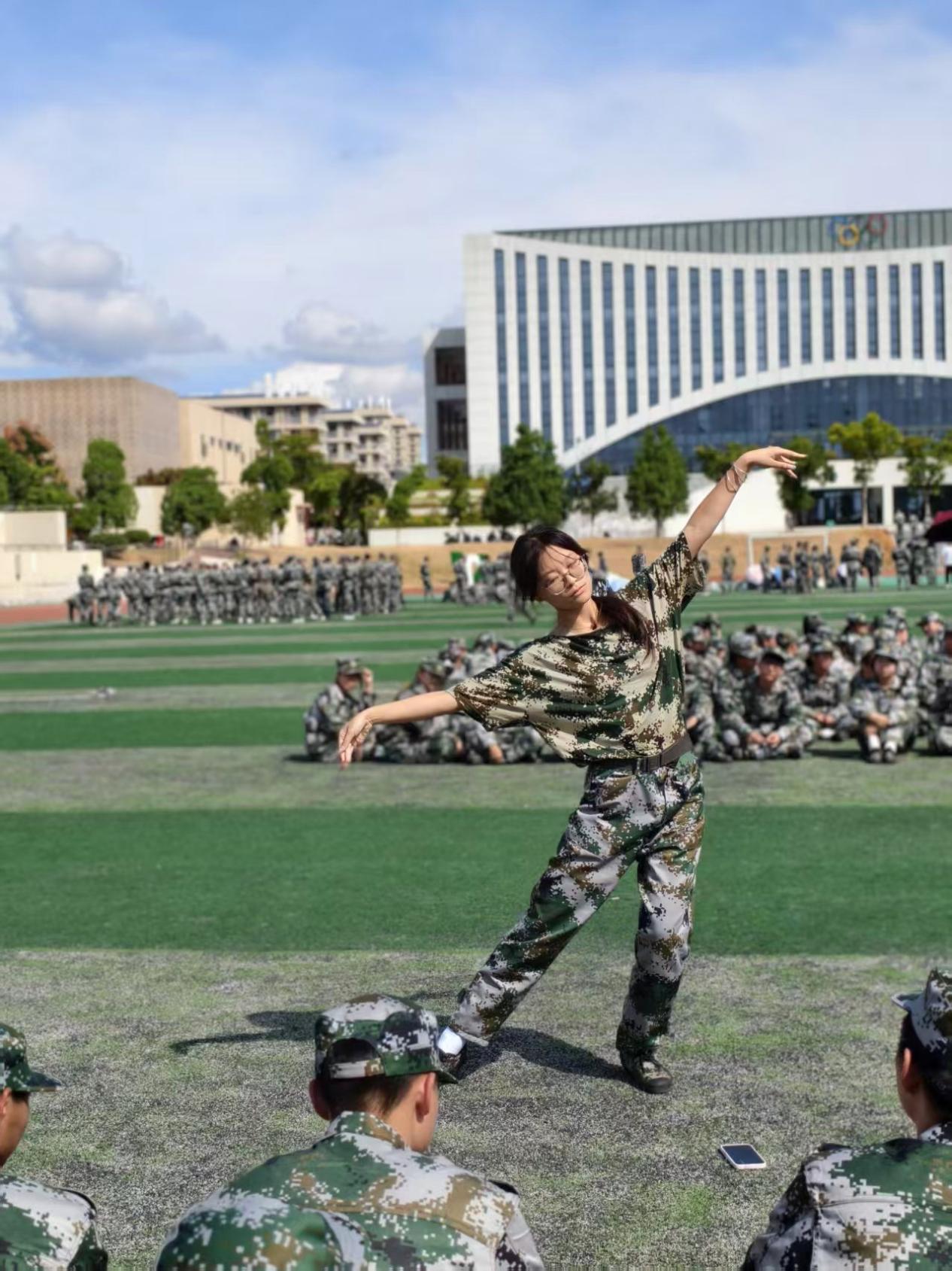当天上午9时30分,军训中场休息哨声吹响,同学们刚刚结束紧张的训练科目。在七营张教导员的组织下,同学们围坐成圈,艺术设计学院的新生们纷纷展示才艺。大家一起合唱了《强军战歌》,声音响亮气势恢宏。其中,2025级数媒专业张丽冰同学的独舞表演《洛春赋》将现场气氛推向高潮,伴随着音乐,她以流畅有力的动作和富有感染力的表现,诠释了当代青年积极向上的精神风貌,引来全场阵阵喝彩。