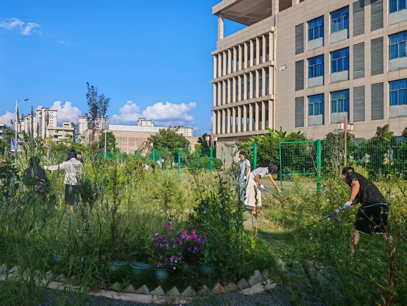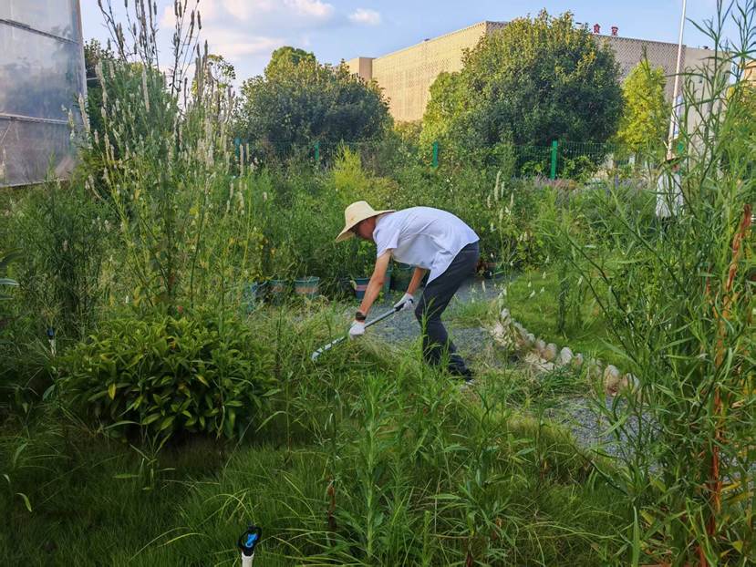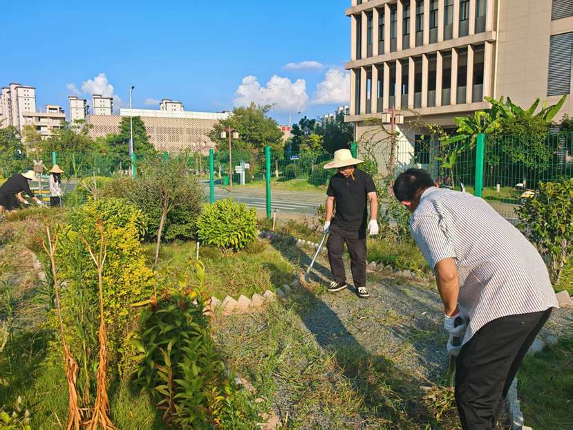 校园大棚三角地作为学院重要的田间教学实践基地和科研实验平台,是开展植物栽培、病虫害防治等教学实践及科研项目的核心区域。随着暑期雨水充沛,周边杂草肆意生长,不仅影响了基地环境整洁,更对新学期田间教学安排、科研实验开展造成了阻碍。为切实解决这一实际问题,教师党支部精准对接教科研需求,将主题党日活动与志愿服务相结合,组织党员教师主动担当、靠前服务。